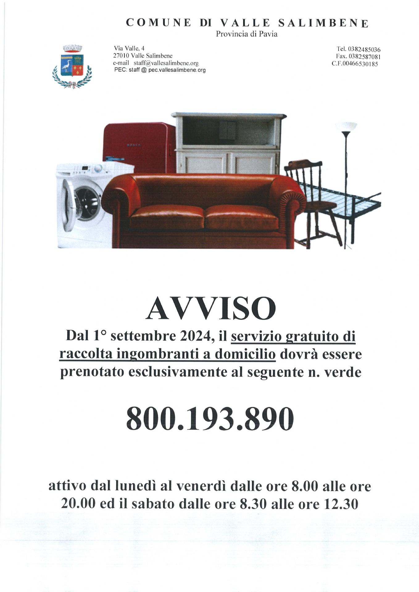 Descrizione Avviso RACCOLTA RIFIUTI INGOMBRANTI A cura di Uffici Anagrafe, Segreteria, Affari Generali Ultimo aggiornamento pagina: 22/07/2024 07:58:07
