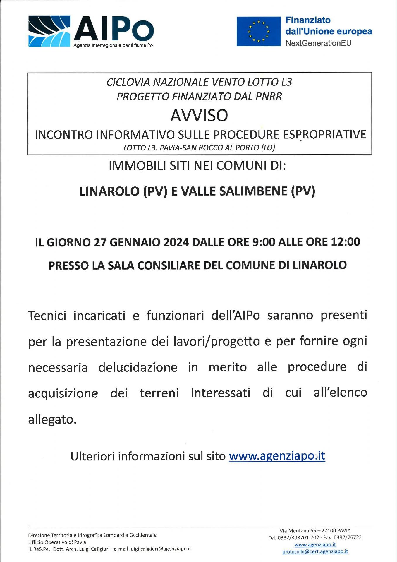 Incontro informativo sulle produre espropriative previsto per il giorno 27 GENNAIO 2024, dalle ore 09:00 alle ore 12:00, presso la SALA CONSILIARE di LINAROLO.