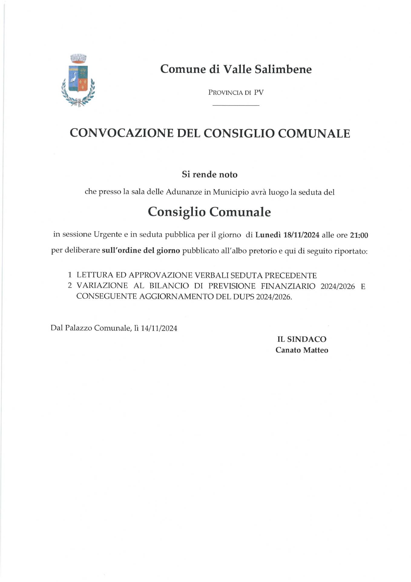 in sessione Urgente e in seduta pubblica per il giorno di Lunedì 18/11/2024 alle ore 21:00
