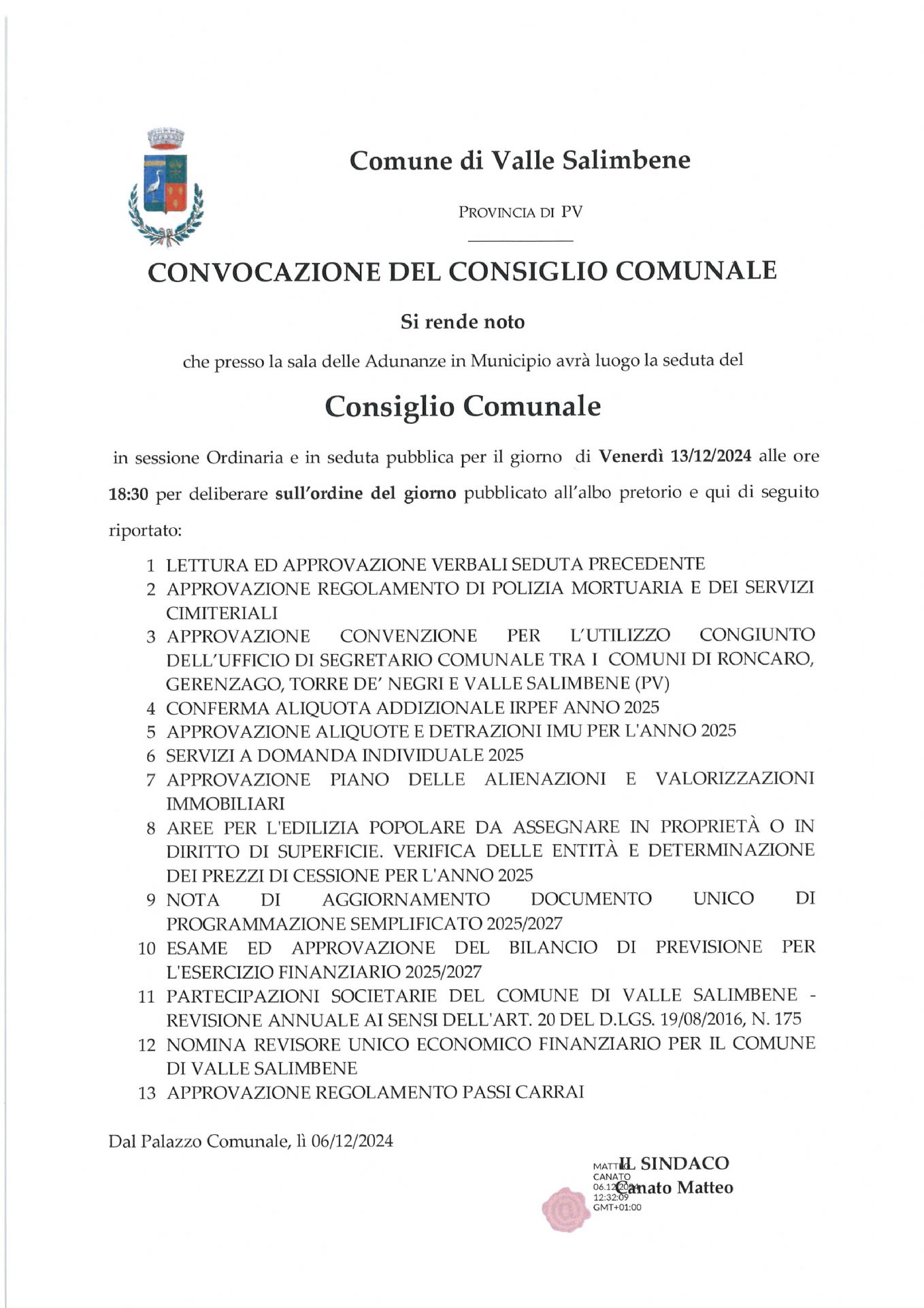 in sessione Ordinaria e in seduta pubblica per il giorno di Venerdì 13/12/2024 alle ore 18:30.