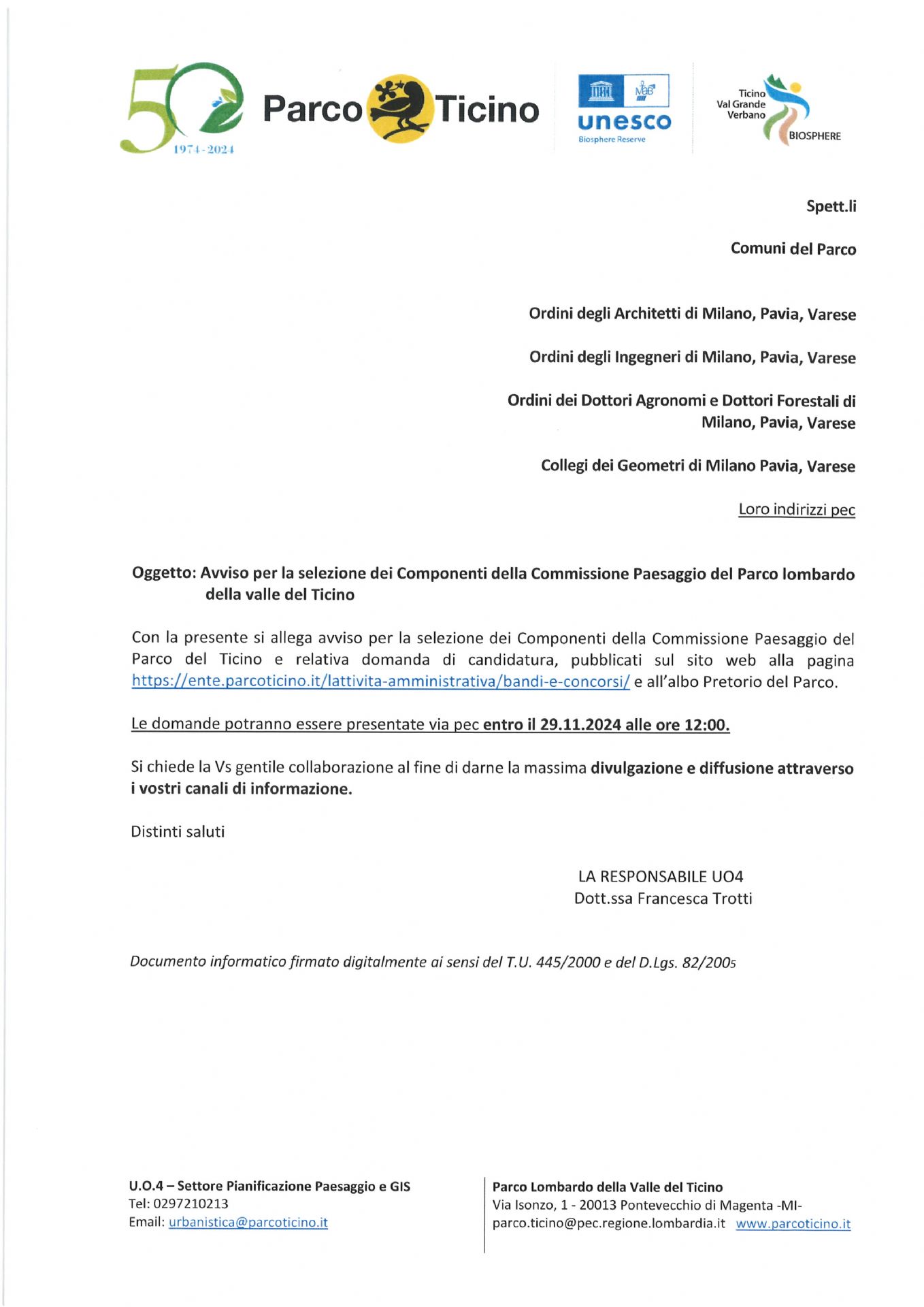 Descrizione Avviso per la selezione dei componenti della commissione paesaggio del Parco Lombardo della Valle del Ticino Allegati Link Avviso (Apre il link in una nuova scheda) A cura di Uffici Anagrafe, Segreteria, Affari Generali Ultimo aggiornamento pagina: 08/11/2024 12:12:47