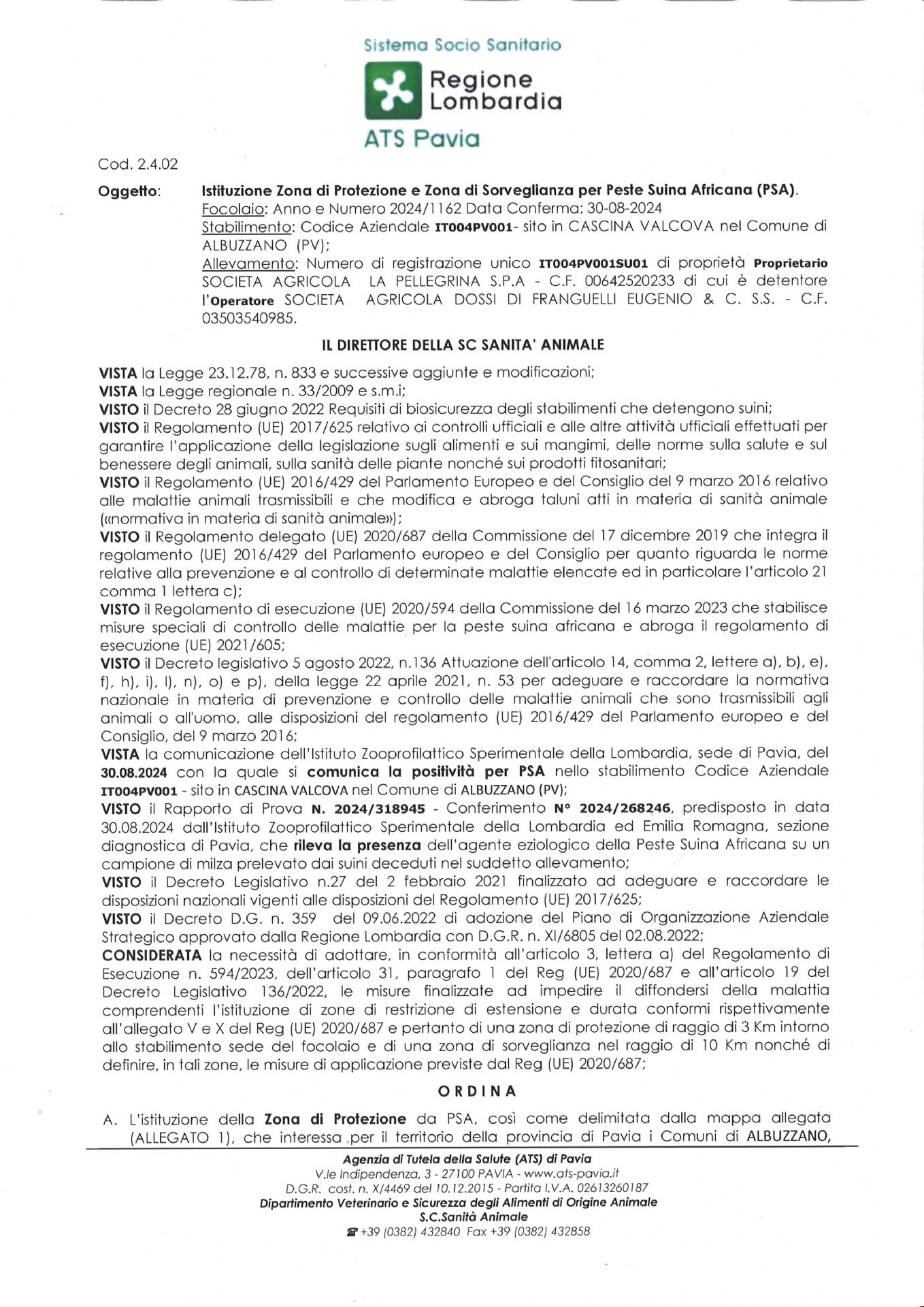 Ordinanza di istituzione Zona di Protezione e Zona di Sorveglianza per Peste Suina Africana (PSA)