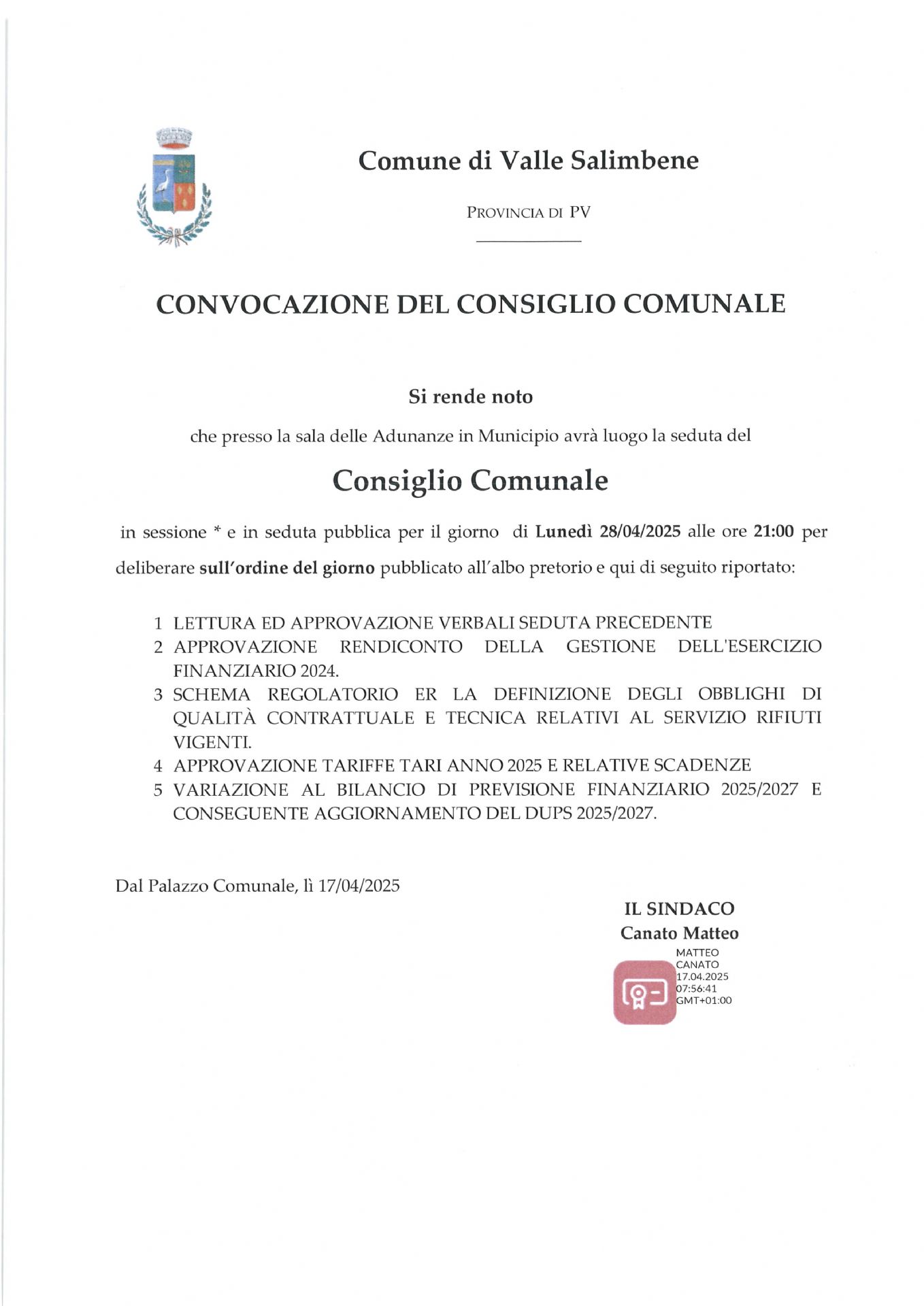 Si rende noto che presso la sala delle Adunanze in Municipio avrà luogo la seduta del Consiglio Comunale in seduta pubblica per il giorno di Venerdì 28/04/2025 alle ore 21:00