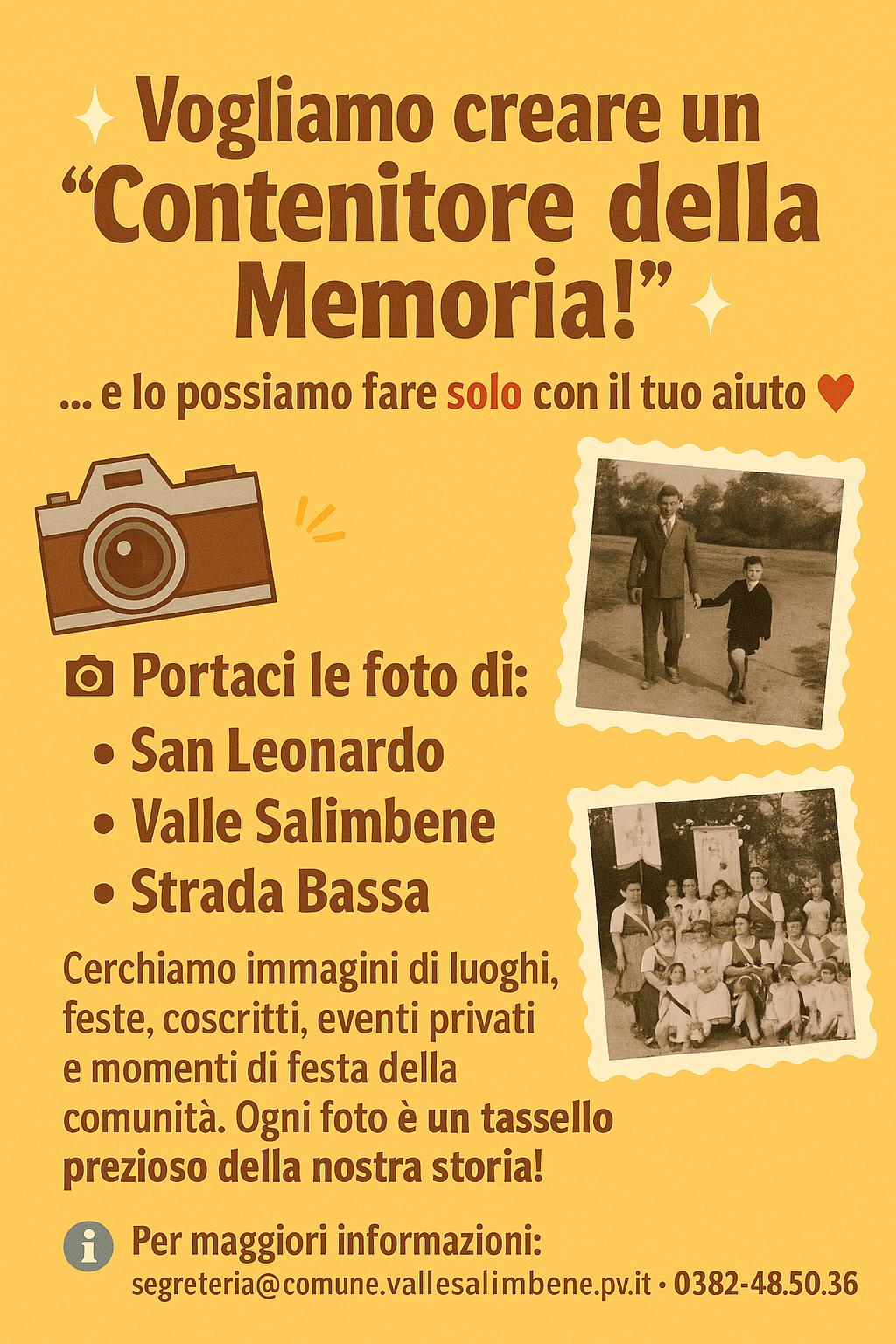 Cerchiamo immagini di luoghi, feste, coscritti, eventi privati e momenti di festa della comunità. Ogni foto è un tassello prezioso della nostra storia!