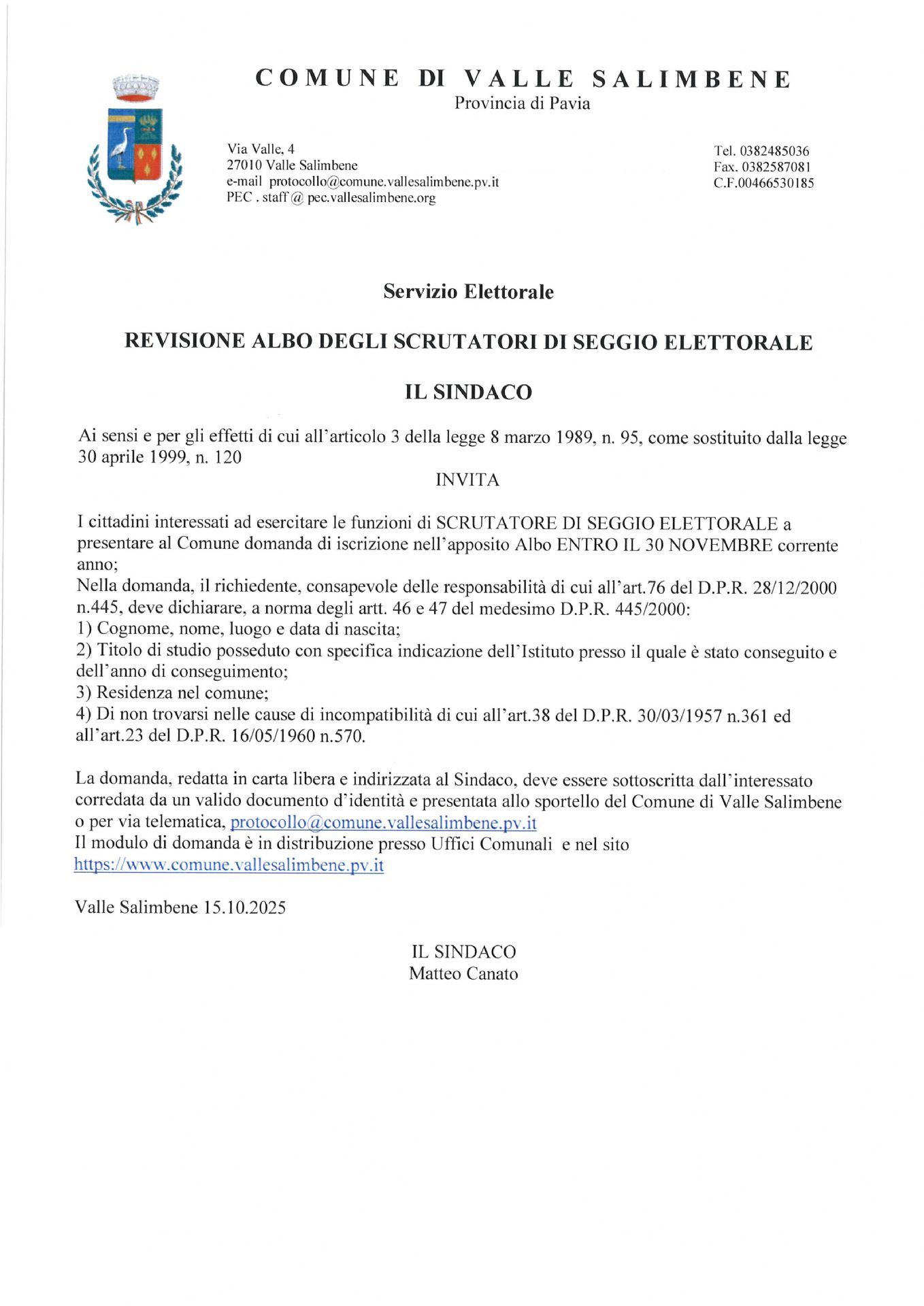 Descrizione manifesto aggiornamento dell'albo delle persone idonee all'ufficio dfi scrutatore di seggio elettorale A cura di Uffici Anagrafe, Segreteria, Affari Generali Ultimo aggiornamento pagina: 15/10/2025 13:39:49