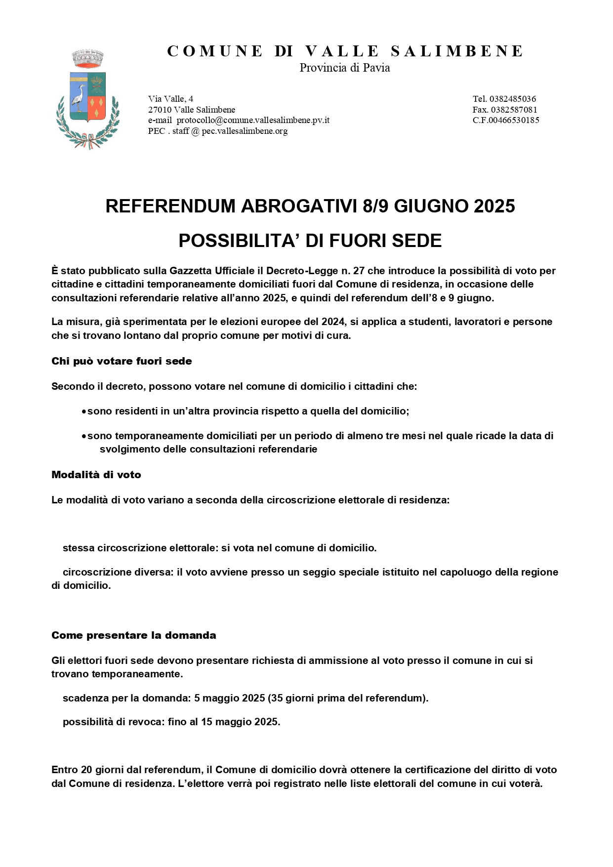Descrizione Referendum Abrogativi 08-09 Giugno 2025 - Possibilità di voto fuori sede A cura di Uffici Anagrafe, Segreteria, Affari Generali Ultimo aggiornamento pagina: 26/03/2025 10:23:06