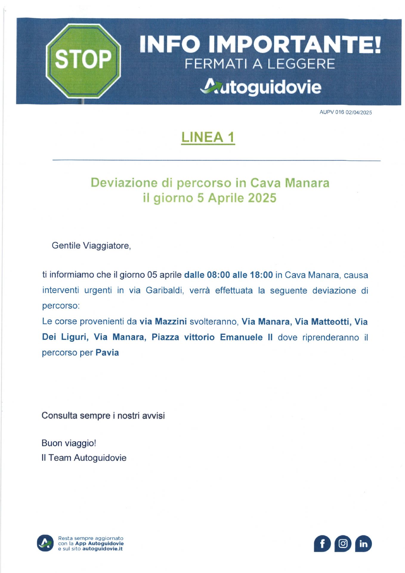 Descrizione Deviazione di percorso in Cava Manara il giorno 5 Aprile 2025 A cura di Uffici Anagrafe, Segreteria, Affari Generali Ultimo aggiornamento pagina: 02/04/2025 13:05:08