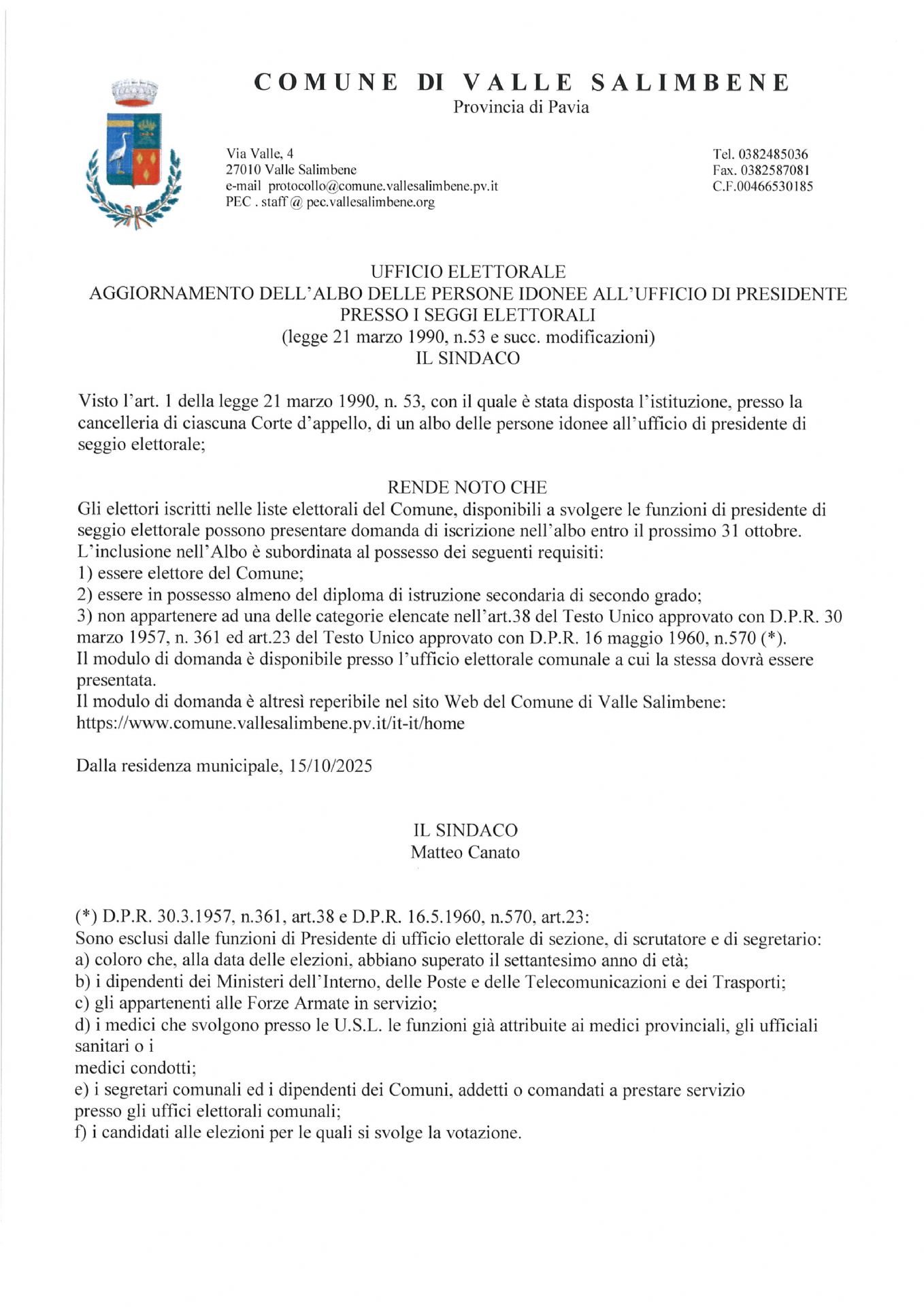 Descrizione avviso per l'aggiornamento dell'albo dei presidenti di seggio A cura di Uffici Anagrafe, Segreteria, Affari Generali Ultimo aggiornamento pagina: 15/10/2025 13:37:00